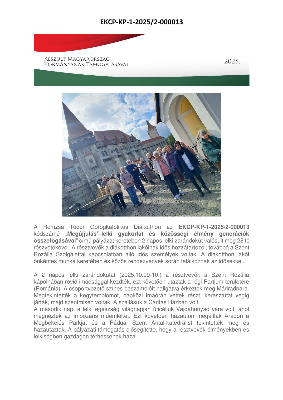 A Romzsa Tódor Görögkatolikus Diákotthon az EKCP-KP-1-2024/2-000062 kódszámú "Közösségi élmények a lelki gyakorlat tükrében" című pályázat szervezésében 3 napos lelki zarándokút valósult meg 38 fő részvétekével. A résztvevők főként a Szent Rozália Szolgálattal kapcsolatban álló idős személyek voltak, akik rendseresen találkoztak már a diákotthon lakóival, hiszen a diákotthon lakói önkéntes munkát végeztek különböző rendezvényeken.A 3 napos lelki zarándokút első napján a résztvevők Debrecenben utaztak és Görögkatolikus liturgián vettek részt, ezt követően Máriapócsra utaztak, elfoglalták a szállást. A második nap Nyírbátorban megtekintették a város nevezetességeit, például Sárkánysétány, Református templomot híres fa harangtornyával, Angyalos Boldogasszony Minorita templomot és Ferences rendházat. Ezt követően visszautaztak Máriapócsra várost néztek, megtekintették a bazilikát, fatemplomot, szentmisén vettek részt a kegytemplomba, majd kolostort látogattak, vacsorát követően a Máriapócson szolgálatot teljesítő Atyákkal folytattak kötetlen beszélgetést. A harmadik nap hazautazás közben Debrecenben meglátogatták a Szent Anna templomot. A három nap igen színes egyéni és közösségi élményeket biztosított a résztvevő időseknek. A népszerű megvalósított programot nagyban támogatta a pályázati forrás.